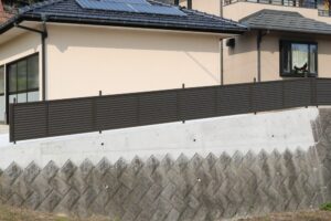 庭部分には隙間の少ないフェンスを設置し、プライバシーをしっかり確保。一方、駐車場側は隙間のあるフェンスを採用し、車通りの確認がしやすい安心設計です。木目調の優しい色合いが全体に統一感を持たせ、お家と自然が調和した温かみある雰囲気を生み出しています。